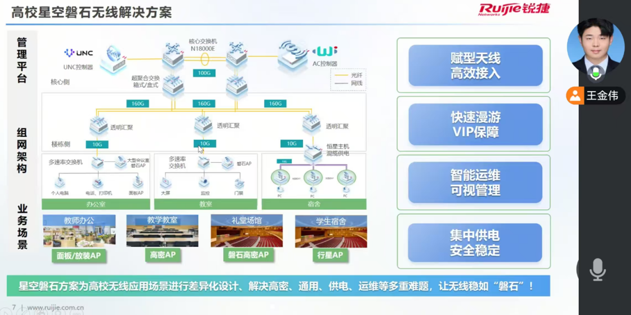 针对上述问题,王经理重点介绍了锐捷“星空磐石”无线校园网解决方案。该方案实现了从“以设备为中心”到“以用户体验为中心”的网络建设理念转变。