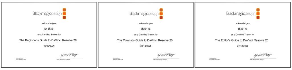 近日,从Blackmagic Design(BMD)官方传来喜讯,我校网络信息中心现代教育技术部部长沈嘉宜,顺利通过DaVinci Resolve 20国际认证导师考核,成功获得由BMD官方颁发的“DaVinci Resolve 20 Certified Trainer”认证证书,正式成为全球为数不多、国内高校中具备该版本官方教学与认证资质的专业导师,为我校影视相关专业技能培训与教育教学注入强劲专业力量。